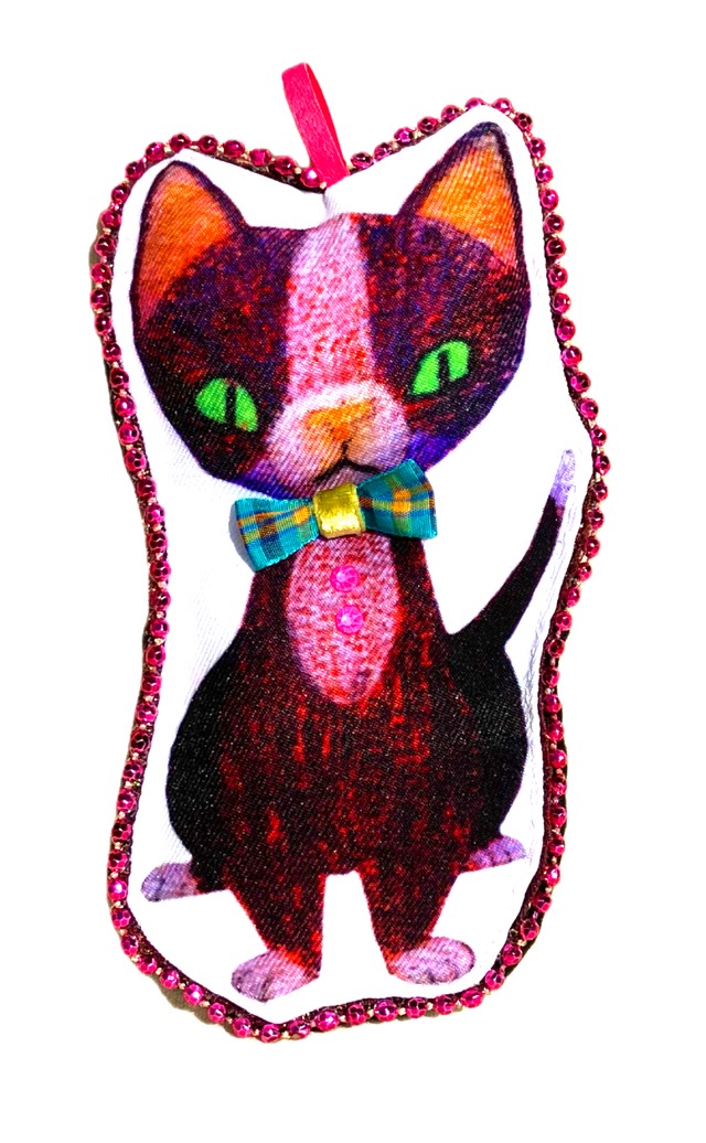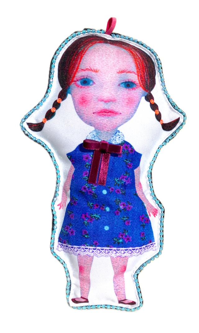 ハンドメイドファブリックドールです。 イラストをプリントした布地のドールをビーズで縁取りラインストーンやベルベットリボンで飾り付けました。 サイズ:17cm x 9.5cm x 3cm ご注文から発送まで1週間ほどお時間をいただきます。