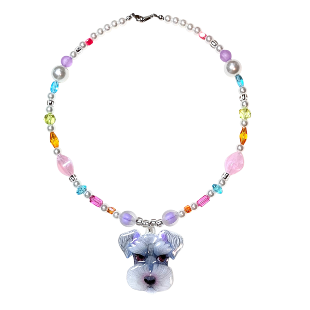 プラスチックレジンペンダントトップとカラフルポップなビーズで作ったネックレスです。 ネックレスの長さは約40cmです。 プラス¥1000でうちの子オーダーメイドも承ります。 ショップに質問する に写真を添付してください。 イラストレーターがイラストを描きプラスチックレジンペンダントトップを作ってカラフルポップなビーズでネックレスに仕立てます。