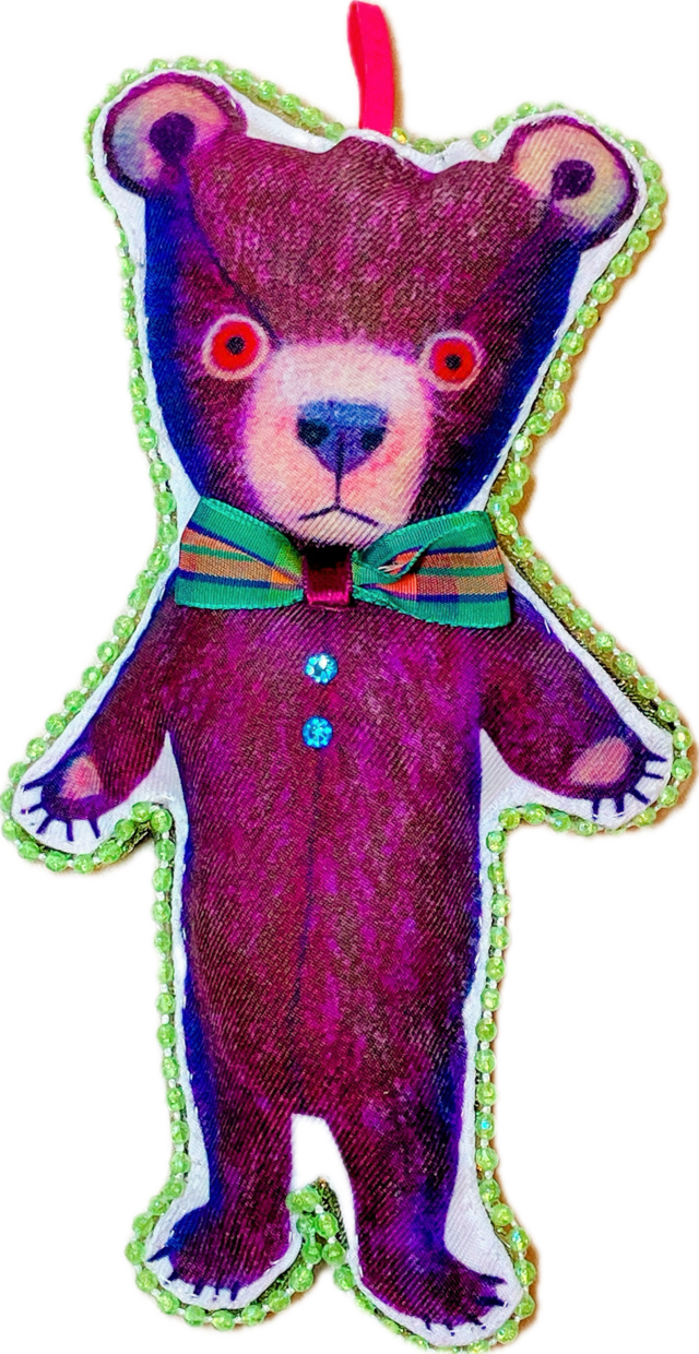 ハンドメイドファブリックドールです。 イラストをプリントした布地のドールをビーズで縁取りラインストーンやベルベットリボンで飾り付けました。 サイズ:24cm x 10.5cm x 3cm ご注文から発送まで1週間ほどお時間をいただきます。
