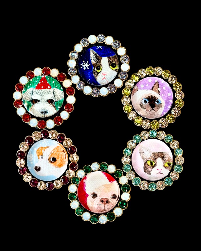 # オーダーメイドうちの子手描きイラストビーズブローチ あなたの大切な「うちの子」をモチーフにした、オーダーメイドの手描きイラストビーズブローチです。写真を元に、絵本の挿絵やグリーティングカードデザインを手掛けるイラストレーターによってアクリル絵の具でキャンバスに描かれたイラストは、ビーズやキラキラパーツで華やかにデコレーションされています。これにより、世界に一つだけの特別な作品が完成しました! 手のひらにすっぽり収まるくらいの大きさです。 イラストにしたい動物の写真を、ショップへの質問ボードにアップしてください。 また、ここははずせないチャームポイントなどお書き添えくださると助かります。 形は長方形と楕円からお選びください。 裏面には安全ピンが付いていますので、バッグやキャップ、Tシャツなど、さまざまなアイテムにおしゃれに付けて楽しむことができます。 大切なペットや愛する家族の姿を、ブローチとして身に着けてみませんか?詳しくは「ショップに質問する」からお気軽にお問い合わせ下さい。あなたの「うちの子」を形にするお手伝いをさせていただきます!