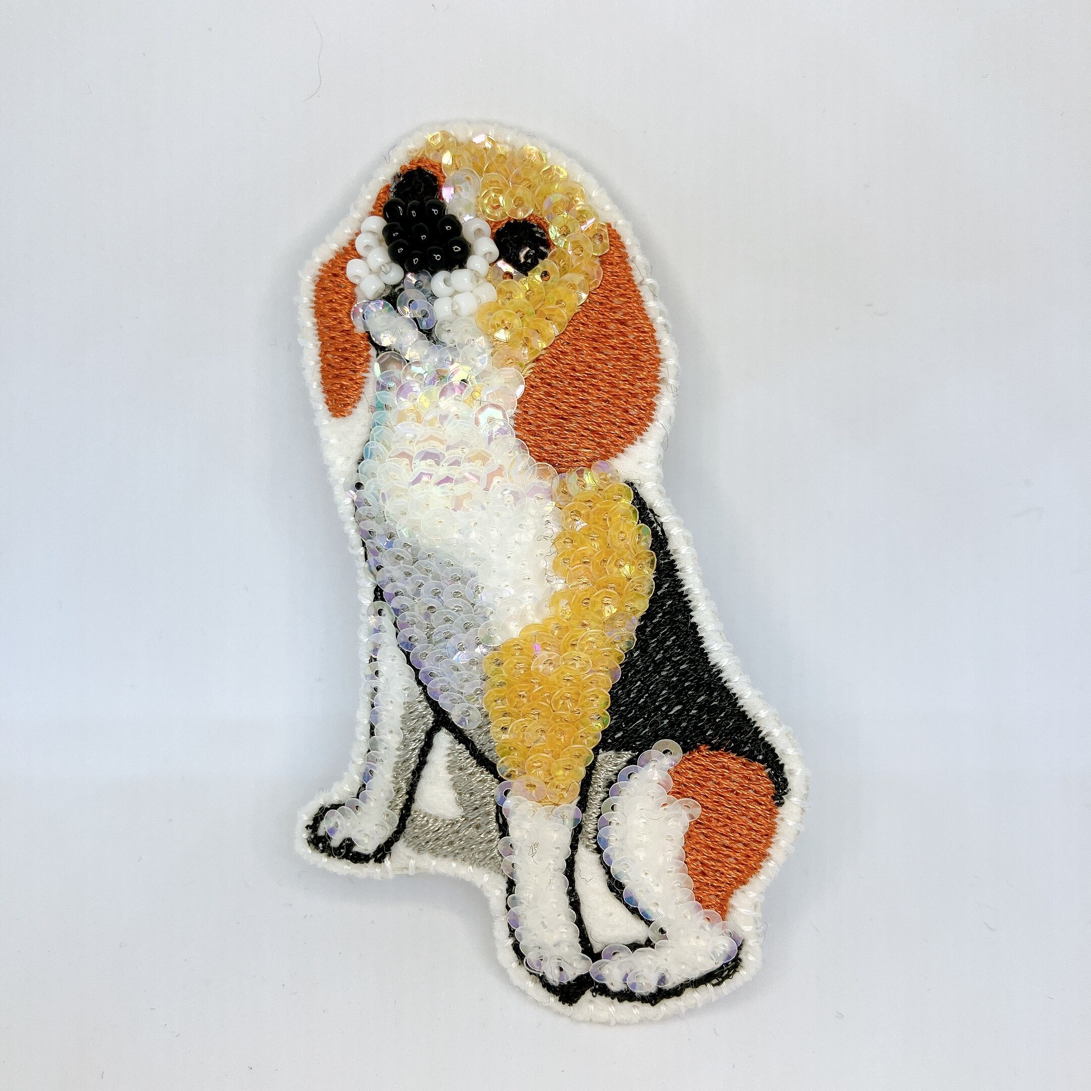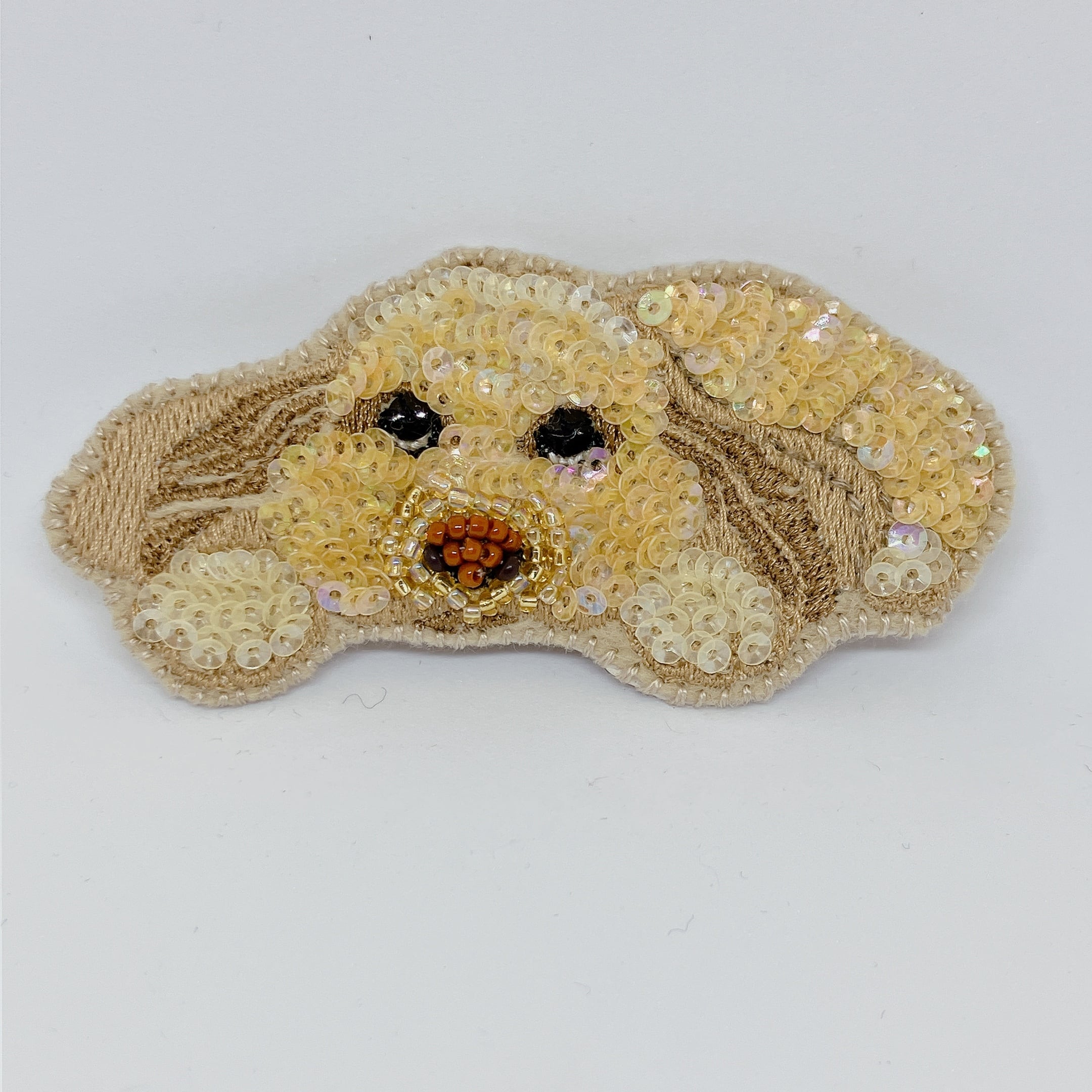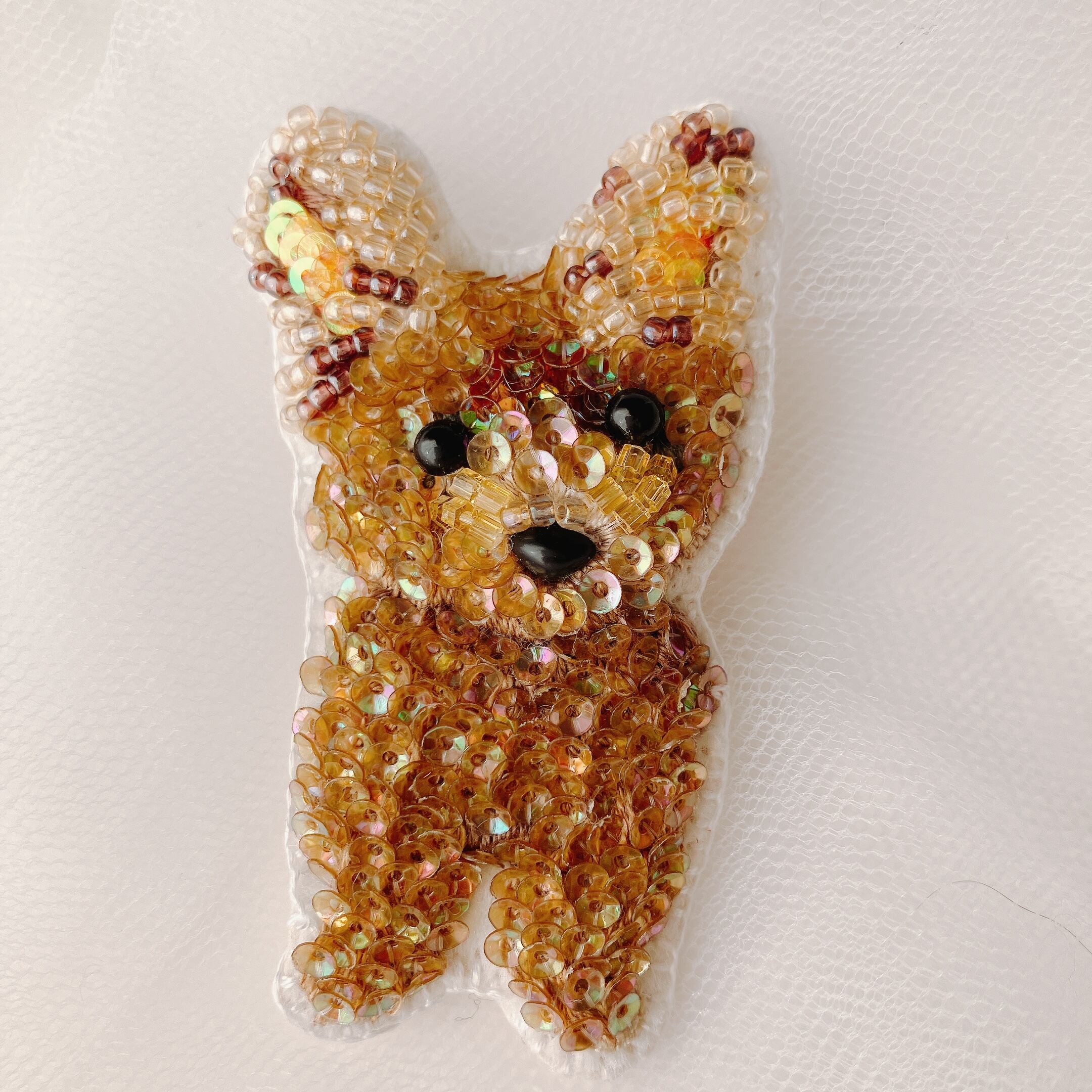お客様の愛するペットを基にしたオリジナルのスパンコールブローチです。イラストレーターが丁寧にデザインを起こし、素敵なスパンコールを一つ一つ手作業で刺繍して仕上げました。愛らしい「うちの子」の姿をしっかりと表現し、特別なアイテムに仕立てています!