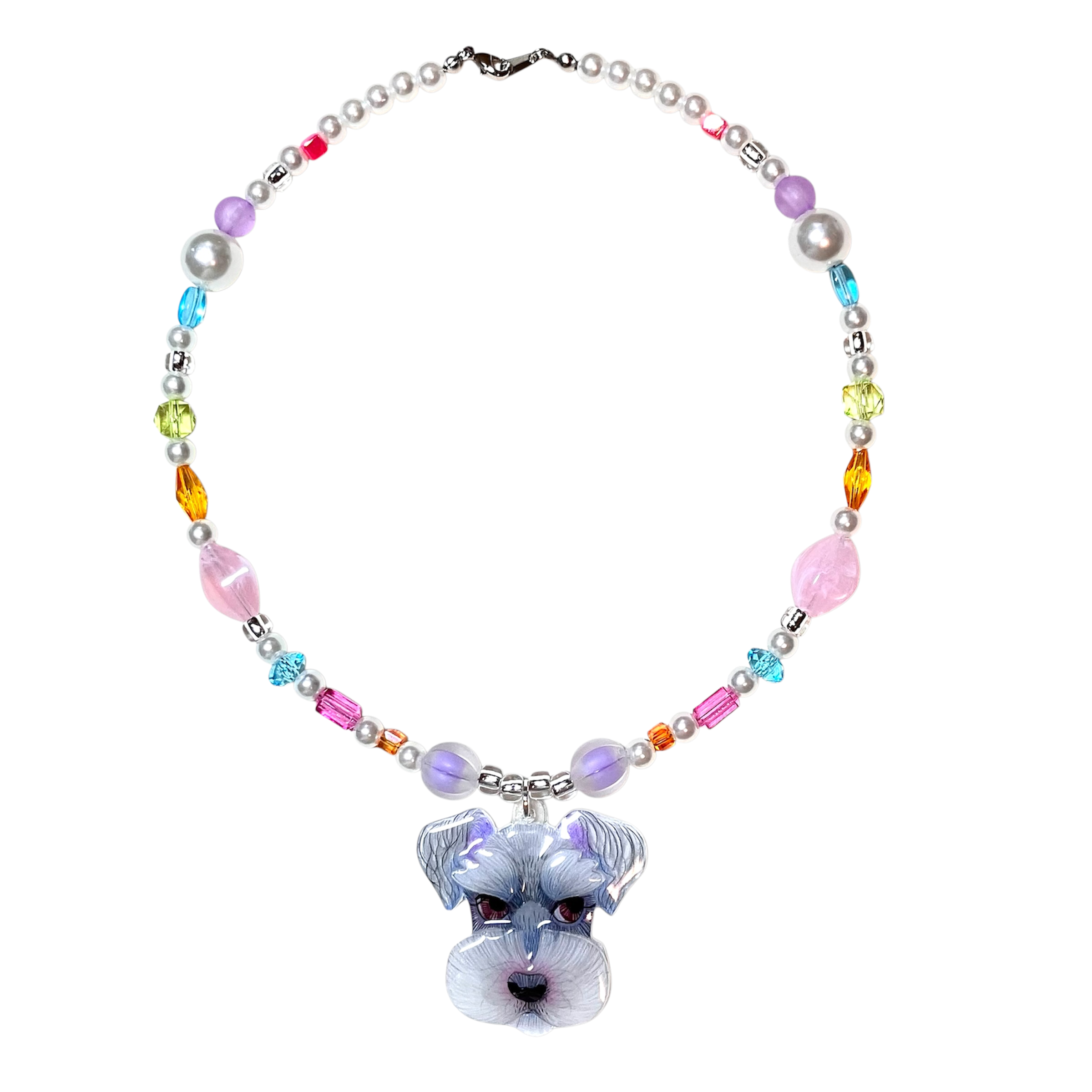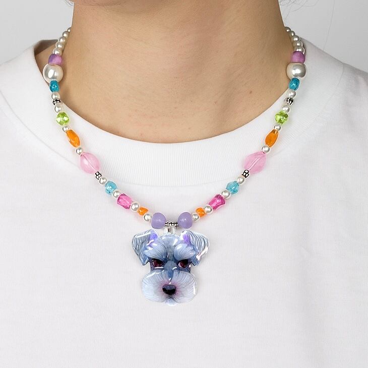 イラストレーターがイラストを描きプラスチックレジンペンダントトップを作ってカラフルポップなビーズでネックレスに仕立てます。