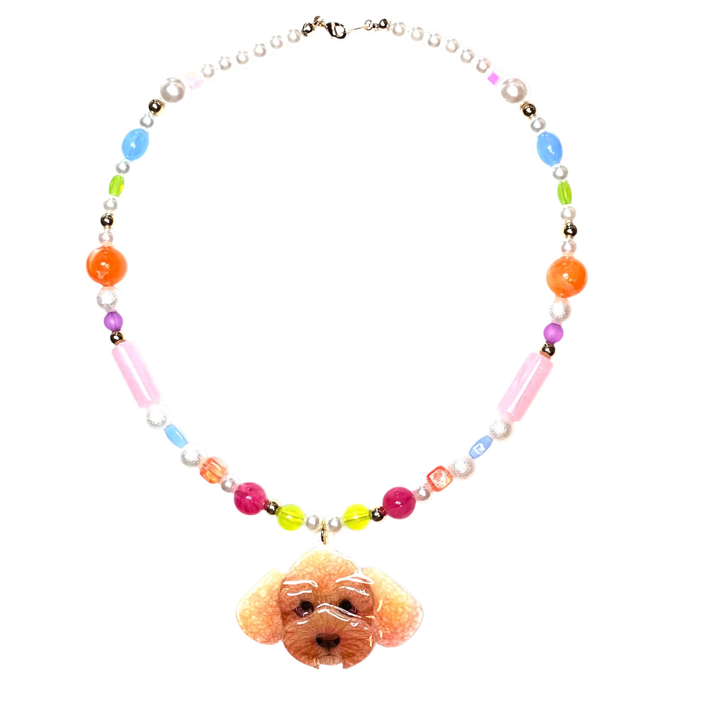 プラスチックレジンペンダントトップとカラフルポップなビーズで作ったネックレスです。