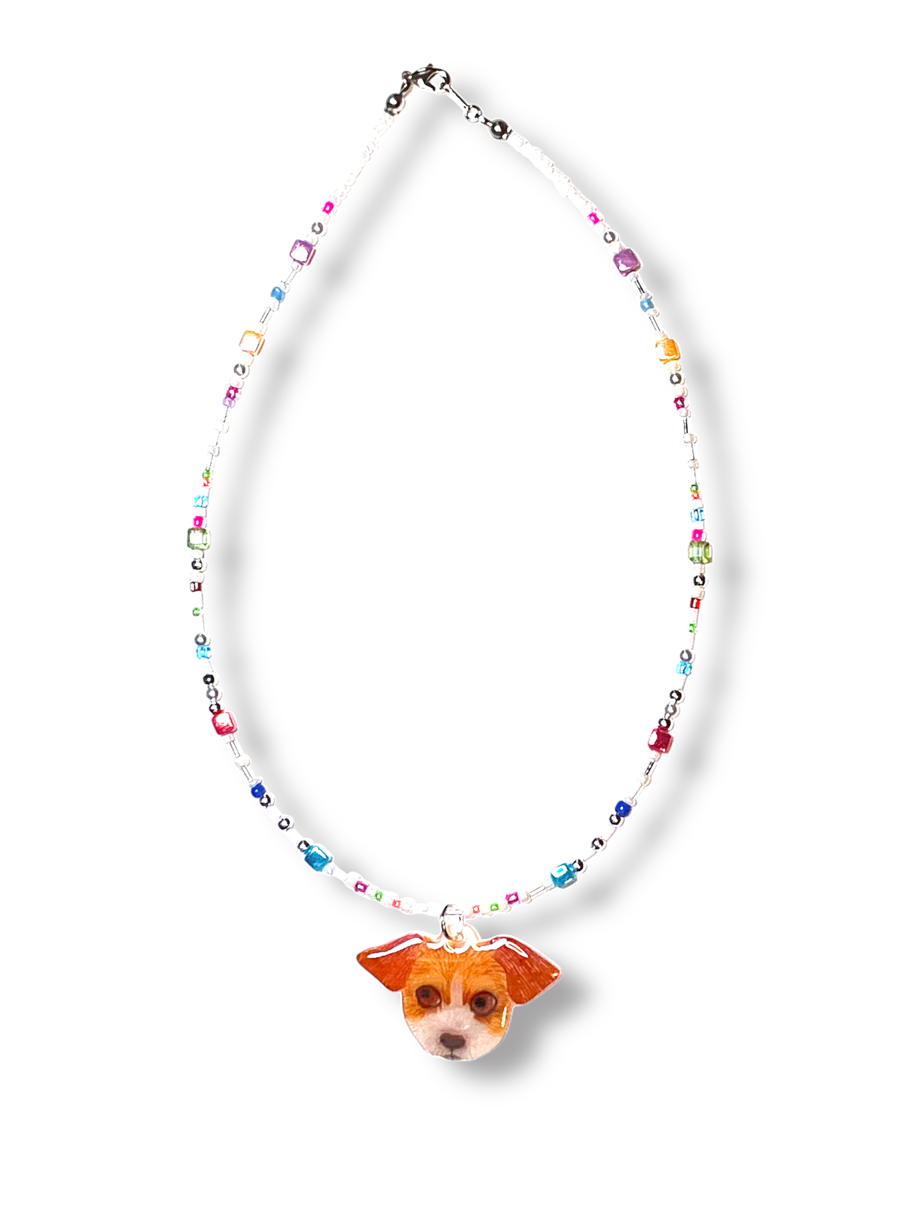 イラストレーターがイラストを描きプラスチックレジンペンダントトップを作ってカラフルポップなビーズでネックレスに仕立てます。